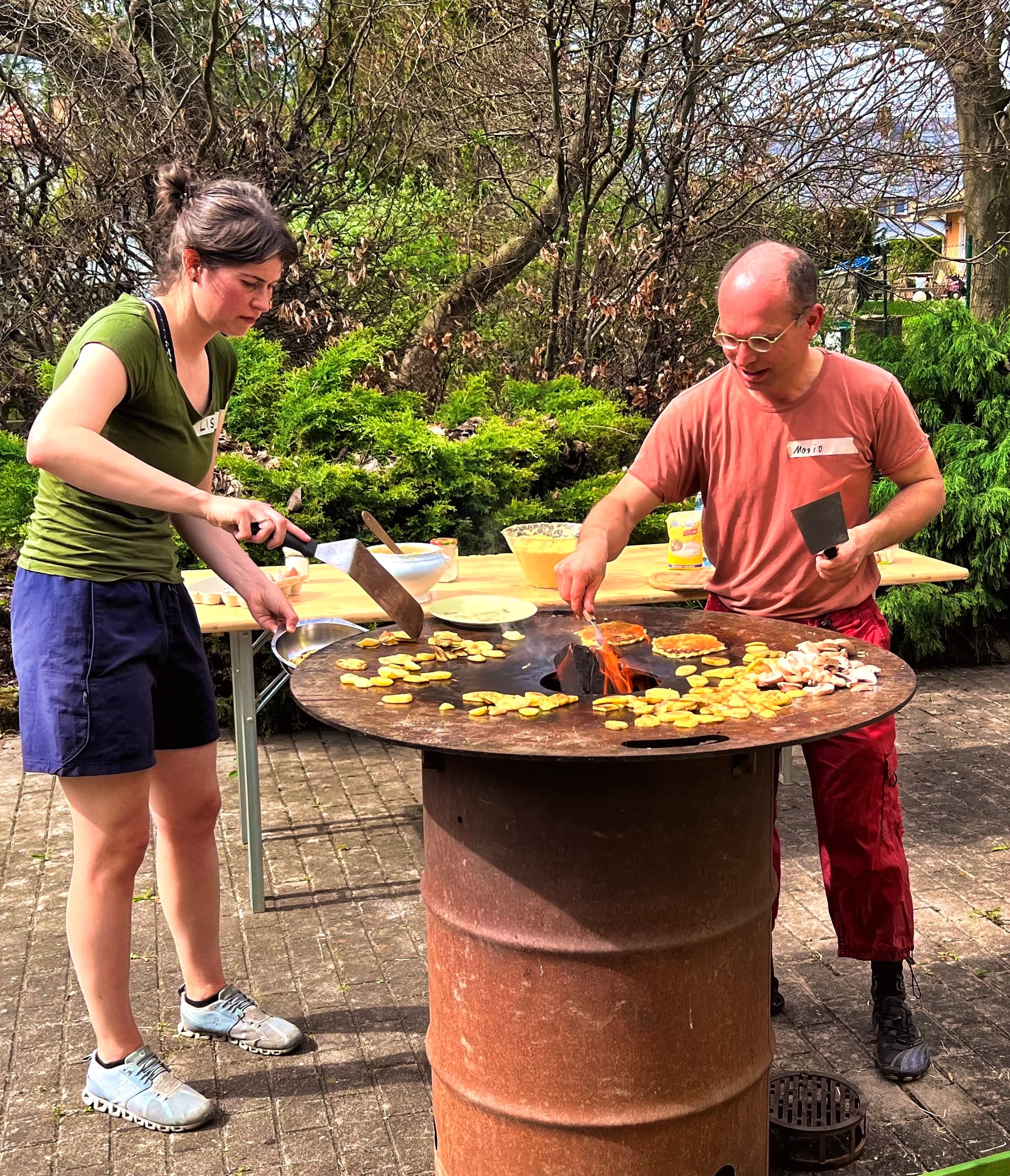 Der Kompost wurde gewendet, die Zwiebeln wurden gewässert, der Randstreifen wurde gemäht, bevor der Löwenzahn reif wird. Der Besuch in der Kinderstube (Jungpflanzenanzucht) war gut besucht. Zum Mitmachbuffet gab es auch leckere Kartoffelpuffer und Kartoffelchips. Aufräumen und Bänke, Tische und Regale streichen rundeten den Tag ab. Tausend Dank an alle, die mitgeholfen haben. Das war ein toller Tag!